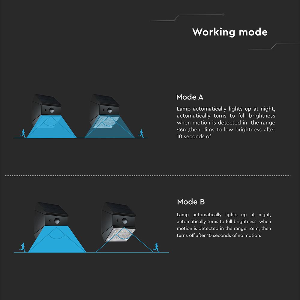 - Mode A: Ανάβει στο 100% με ανίχνευση κίνησης και στη συνέχεια μειώνεται σε 3% (dim) όταν η κίνηση σταματήσει.
