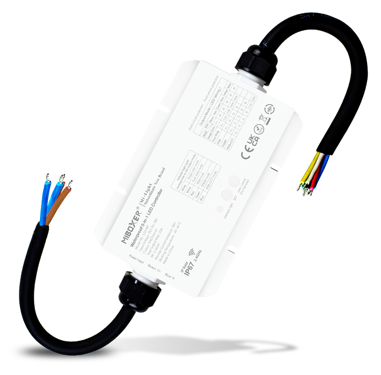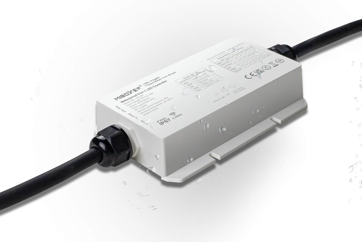 Ο MiBoxer Waterproof 5-in-1 LED Strip Controller 2.4 GHz είναι μια πολυδύναμη και ευέλικτη μονάδα ελέγχου LED, σχεδιασμένη για να καλύψει τις ανάγκες τόσο εσωτερικών όσο και εξωτερικών εγκαταστάσεων LED strips. Με την υποστήριξη 5 λειτουργιών φωτισμού (μονόχρωμο, CCT/dual white, RGB, RGBW, RGB+CCT), μπορείς να ρυθμίσεις τον φωτισμό ακριβώς όπως θέλεις — από σταθερό λευκό φωτισμό μέχρι πολύχρωμες δυναμικές σκηνές.