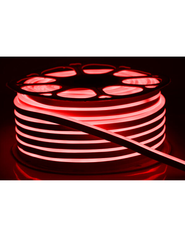 Ταινία LED Dome neon flex με τάση τροφοδοσίας 220-240V και ονομαστική ισχύς ανά μέτρο 8W. Η θερμοκρασία χρώματος είναι κόκκινο και η απόδοση ανά μέτρο 900lm. Ο βαθμός στεγανότητας είναι IP65, η γωνια δέσμης 160 μοίρες και η διάρκεια ζωής της ταινία είναι 25000h. Ο τύπος LED είναι SMD2835 και σε κάθε μέτρο υπάρχουν 120 LED. Τα σημεία κοψίματος της ταινίας βρίσκονται κάθε 1 μέτρο και ο τρόπος κάμψης της είναι side bending. Το κάθε καρούλι διαθέτει 50 μέτρα ταινίας.