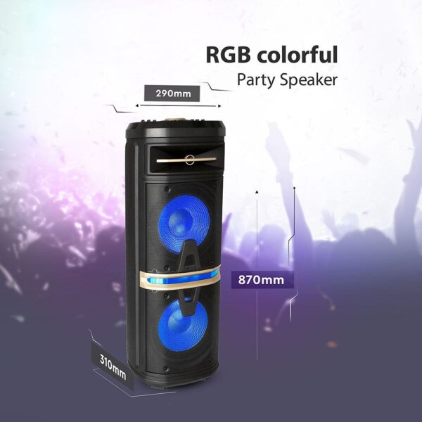 V-TAC Ασύρματο ηχείο κατάλληλο και για Karaoke. To ηχείo διαθέτει σχεδιασμό τύπου trolley , με κλασικούς τροχούς στο κάτω μέρος και λαβή από μαύρο πλαστικό. Η μεταλλική μπροστινή μάσκα καλύπτει τα 2 γούφερ 254 mm (10 ιντσών) το καθένα. Στο πάνω μέρος βρίσκεται ο πίνακας κουμπιών και οι είσοδοι ήχου (USB, AUX, MicroSD και 3 x Jack 6.3 mm χρήσιμα για 2 μικρόφωνα και κιθάρα).