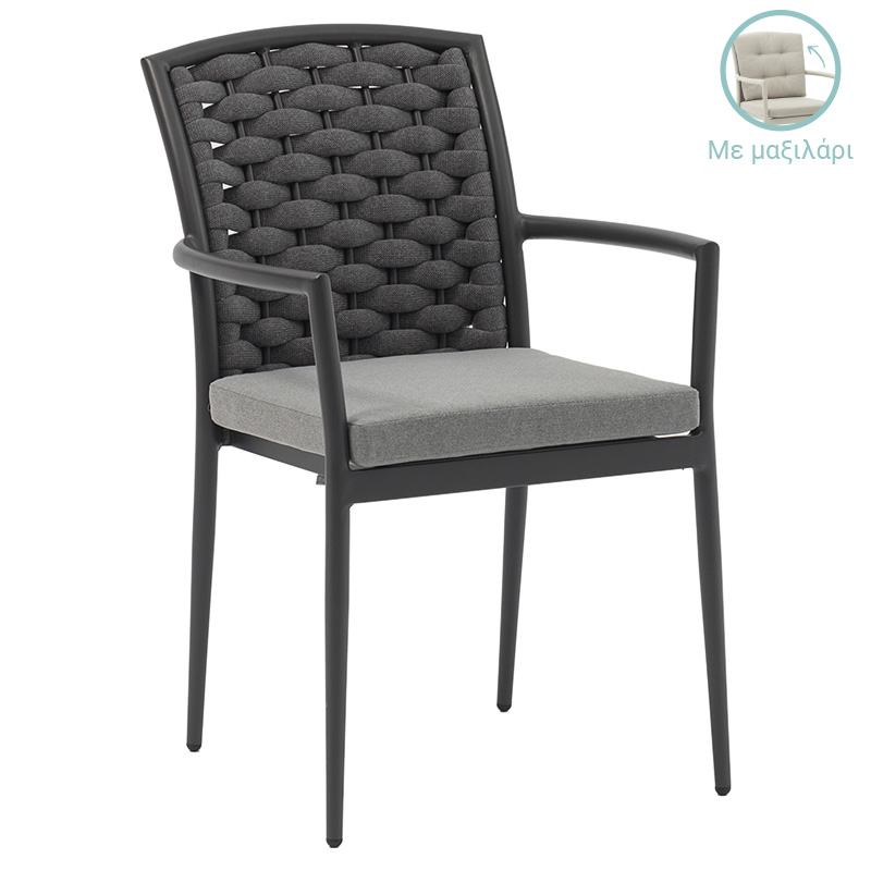 Πολυθρόνα Moritz pakoworld αλουμίνιο ανθρακί σχοινί-μαξιλάρι γκρι – 216-000009