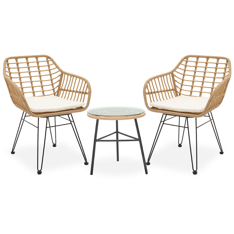 Σαλόνι κήπου Gaus-Naoki σετ 3τεμ pakoworld μέταλλο μαύρο-pe φυσικό.Θέλετε ένα ανθεκτικό σετ σαλονιού για το μπαλκόνι ή τον κήπο σας που θα αναβαθμίσει αισθητικά το χώρο σας; Η σειρά Gaus-Naoki είναι ιδανική για εσάς καθώς συνδυάζει την αισθητική με την ποιότητα κατασκευής.Το σετ περιλαμβάνει δύο πολυθρόνες και ένα τραπέζι.Τεχνικά χαρακτηριστικά: Σταθερός σκελετός από εξαιρετικής ποιότητας μέταλλο (πόδια D50mm) με αντοχή στην καταπόνηση και στη φθορά. Κυρίως επιφάνεια τραπεζιού και πολυθρόνας από PE rattan. Το PE rattan είναι ένα είδος οικολογικού συνθετικού rattan, ανακυκλώσιμο και με μεγαλύτερη ανθεκτικότητα σε σχέση με τα άλλα είδη. Με στρογγυλές ακμές για την αποφυγή τραυματισμών. Το τραπέζι φέρει tempered γυαλί 5χιλ – διάφανο. Μεγάλη ανθεκτικότητα: κατάλληλο για χρήση σε εξωτερικό χώρο εκτεθειμένο στις καιρικές συνθήκες και την υγρασία. Προσφέρεται σε χρώμα: Φυσικό – Μαύρο. Η πολυθρόνα φέρει μαξιλαράκι για την έδρα του καθίσματος 2εκ σε λευκό ivory χρώμα το οποίο διαθέτει φερμουάρ.Διαστάσεις προϊόντων:Διάσταση τραπεζιού: Διάμετρος: 46 εκ. Ύψος: 45 εκ.Διάσταση πολυθρόνας: Μήκος: 59 εκ. Πλάτος: 57 εκ. Ύψος: 81 εκ. Ύψος έδρας: 43 εκ.Πληροφορίες υλικών: PE Rattan: Είναι ένα δημοφιλές υλικό, απομίμηση φυσικού rattan, που χρησιμοποιείται στην κατασκευή επίπλων και αξεσουάρ. Κατασκευάζεται από πολυαιθυλένιο (polyethylene), το οποίο είναι μια ανθεκτική συνθετική πολυμερής ρητίνη. Είναι ανθεκτικό στις καιρικές συνθήκες, δεν φθείρεται από τον ήλιο ή τη βροχή και δεν ξεθωριάζει, ενώ παράλληλα είναι φιλικό προς το περιβάλλον. Tempered glass- Γυαλί ασφαλείας: Το tempered glass, γνωστό και ως σκληρυμένο ή θερμικά επεξεργασμένο γυαλί, είναι ένα είδος γυαλιού ασφαλείας που έχει υποστεί ειδική επεξεργασία για να αυξήσει την αντοχή του σε σύγκριση με το απλό γυαλί. Η διαδικασία θερμικής επεξεργασίας περιλαμβάνει τη θέρμανση του γυαλιού σε υψηλή θερμοκρασία και την απότομη ψύξη του. Αυτό δημιουργεί μια τάση συμπίεσης στην επιφάνεια του γυαλιού και μια τάση εφελκυσμού στο εσωτερικό, καθιστώντας το πιο ανθεκτικό σε κρούσεις, θερμικά σοκ και γρατζουνιές. Eίναι περίπου 5 φορές πιο ανθεκτικό από το απλό γυαλί σε κρούσεις. Ένα σημαντικό πλεονέκτημα είναι πως σε περίπτωση θραύσης, το tempered glass θρυμματίζεται σε μικρά, αμβλεία θραύσματα, μειώνοντας τον κίνδυνο σοβαρού τραυματισμού. Χρησιμοποιείται σε τραπέζια, γραφεία, έπιπλα τηλεόρασης κ.ά. Μέταλλο: Το μέταλλο χρησιμοποιείται ευρέως στην κατασκευή επίπλων, προσφέροντας μια σειρά από πλεονεκτήματα σε σχέση με άλλα υλικά. Είναι εξαιρετικά ανθεκτικό σε φθορές, ιδανικό για έπιπλα που προορίζονται για καθημερινή χρήση σε ένα απαιτητικό περιβάλλον. Διατηρεί το σχήμα και τη δομή του άψογα, εξασφαλίζοντας σταθερότητα και μακροζωία στα έπιπλα. Εκτός από τις ιδιότητες που αναφέρθηκαν παραπάνω, το μέταλλο μπορεί να έχει και άλλα χαρακτηριστικά, όπως η αντιμικροβιακή δράση (χαλκός) ή υπεραγωγιμότητα (μολυβδένιο). Ύφασμα μαξιλαριού: Το ύφασμα είναι ένα ευέλικτο υλικό που κατασκευάζεται από την ύφανση, πλέξιμο, βελονιά ή συγκόλληση ινών. Αυτές οι ίνες μπορεί να είναι φυσικές, όπως βαμβάκι, μαλλί ή μετάξι, ή συνθετικές, όπως πολυεστέρας ή νάιλον. Η ύφανση των ινών δημιουργεί ένα δίκτυο που δίνει στο ύφασμα τις ιδιότητές του, όπως η αντοχή, η απαλότητα, η διαπνοή και η ελαστικότητα. Υπάρχουν άπειρες ποικιλίες υφασμάτων, καθεμιά με τα δικά της μοναδικά χαρακτηριστικά και χρήσεις.Οδηγίες 