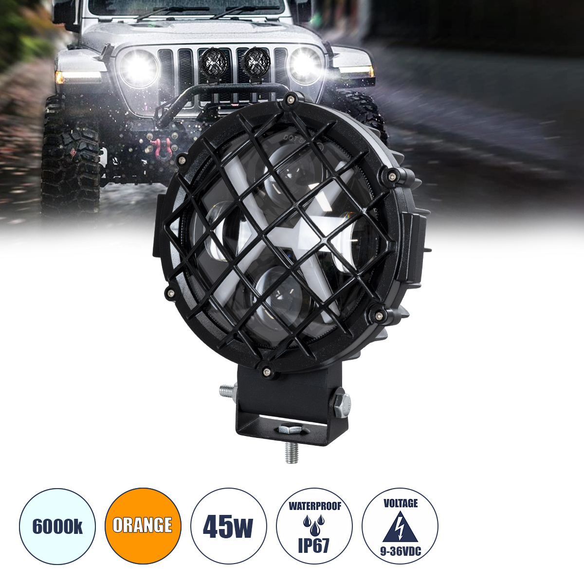 GloboStar® 85438 Vehicle & JEEP Work Lights – Φώτα Εργασίας για Οχήματα και JEEP με X Light DRL & Φλας LED High Power 45W DC 9-36V Αδιάβροχo IP67 Πορτοκαλί & Ψυχρό Λευκό 6000K M17 x Π8 x Υ21cm