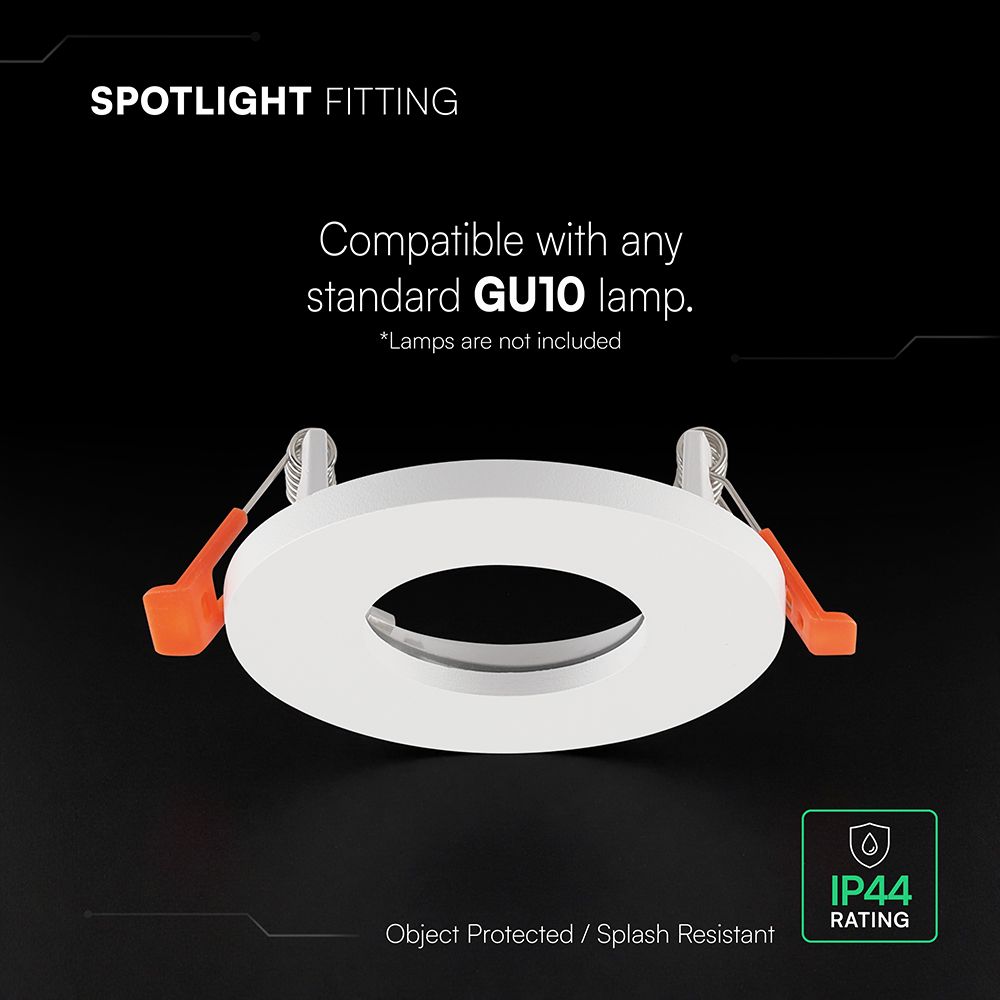 Αδιάβροχο στρογγυλό σποτ οροφής V-TAC  από ανθεκτικό αλουμίνιο σε λευκό χρώμα. Με πιστοποίηση IP44, είναι η ιδανική λύση για μπάνια, εξωτερικά υπόστεγα και χώρους με αυξημένη υγρασία. • Ντουί: GU10 (δεν περιλαμβάνεται λαμπτήρας) • Προστασία: IP44 (Κατάλληλο για μπάνια/εξωτερικούς χώρους) • Υλικό: Σώμα από υψηλής ποιότητας αλουμίνιο • Εγκατάσταση: Χωνευτό / Οροφής