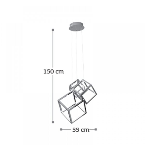 Πρόκειται για ένα χρώμιο κρεμαστό φωτιστικό κατασκευασμένο από αλουμίνιο. Στο εσωτερικό του υπάρχει λευκή ακρυλική επιφάνεια που καλύπτει τον led φωτισμό θερμής απόχρωσης. Η ανάρτησή του είναι ρυθμιζόμενη ώστε να προσαρμοστεί σε κάθε χώρο. Η γεωμετρική του σχεδίαση ταιριάζει σε όλους τους μοντέρνους χώρους.