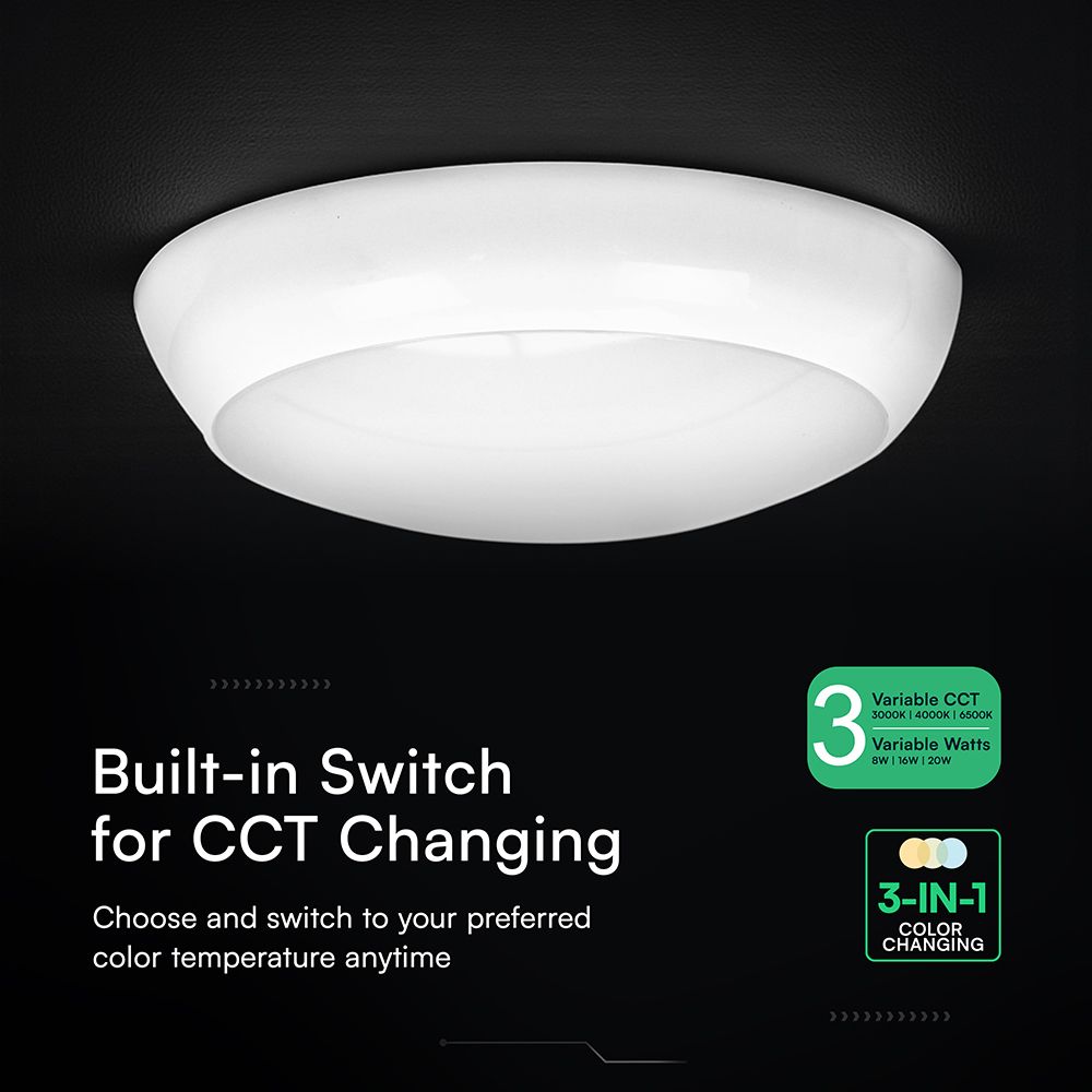 Πλαφονιέρα LED Στρογγυλή Φ320 Λευκή V-TAC CREE Chip 8W/16W/20W CCT 2700lm IP65 6yrs Wty – 801-24-6 είναι μια ευέλικτη λύση φωτισμού που σου επιτρέπει να επιλέξεις ανάμεσα σε 3 επίπεδα ισχύος (8W, 16W ή 20W) και 3 θερμοκρασίες φωτός (CCT 3-in-1) — ζεστό, ουδέτερο ή ψυχρό λευκό — ώστε να προσαρμόζεται ιδανικά στις ανάγκες κάθε χώρου.