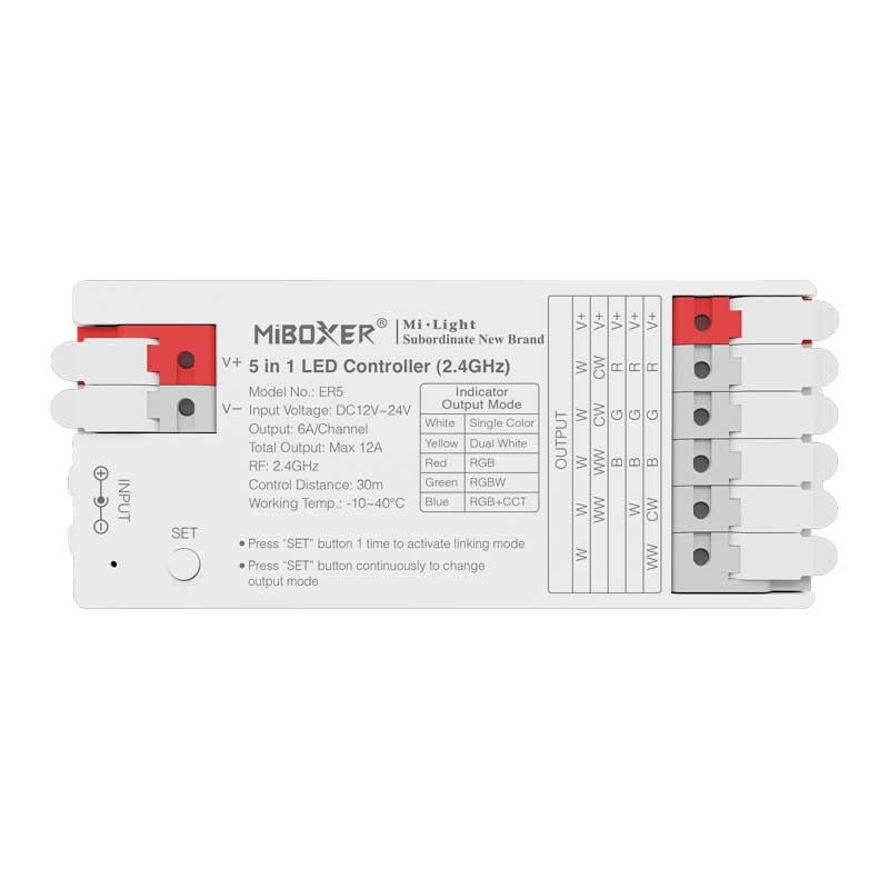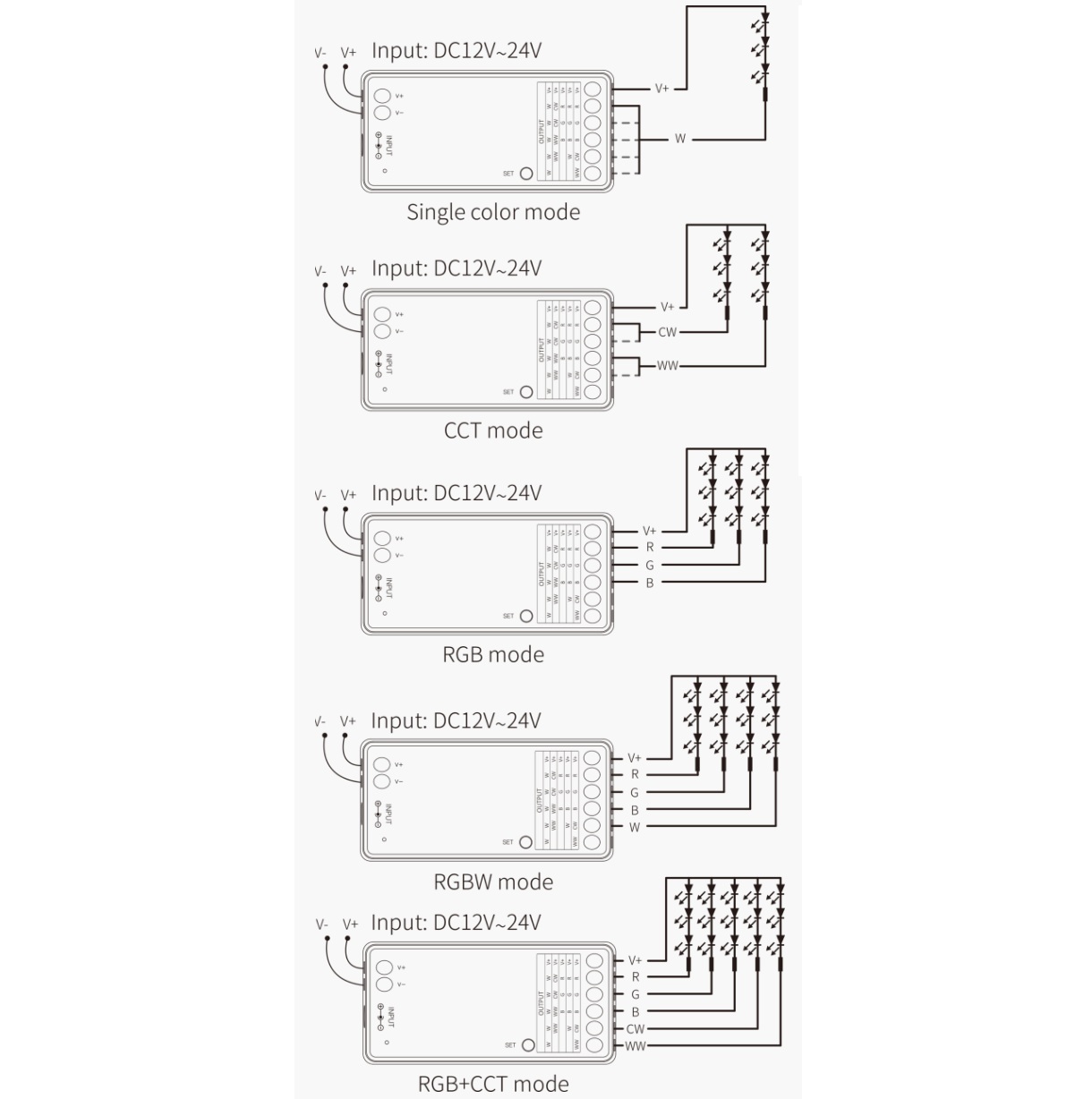 - 5‑in‑1 LED controller (MONO / CCT / RGB / RGBW / RGBCCT)