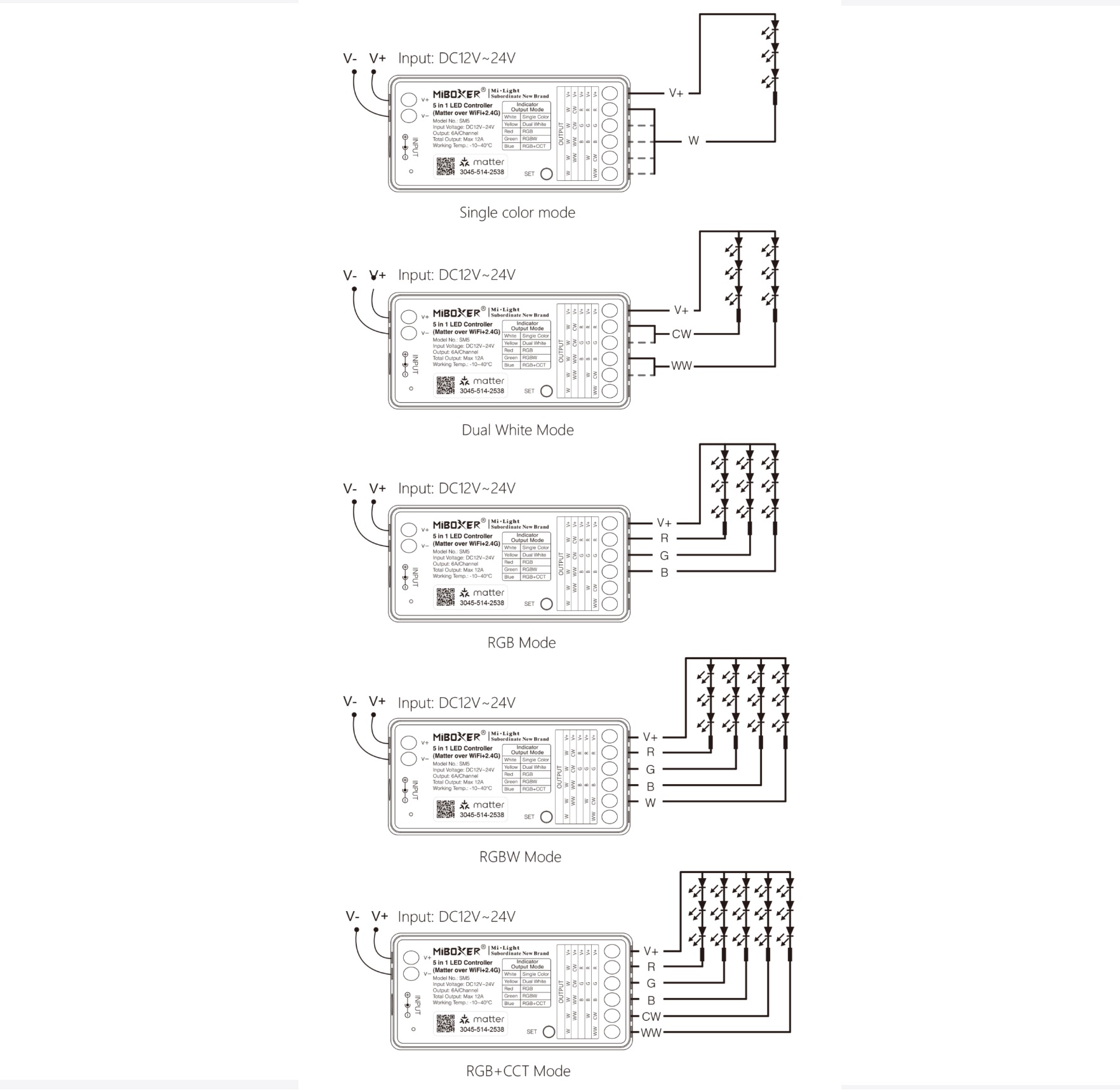 - 5‑in‑1 LED controller (MONO / CCT / RGB / RGBW / RGBCCT)