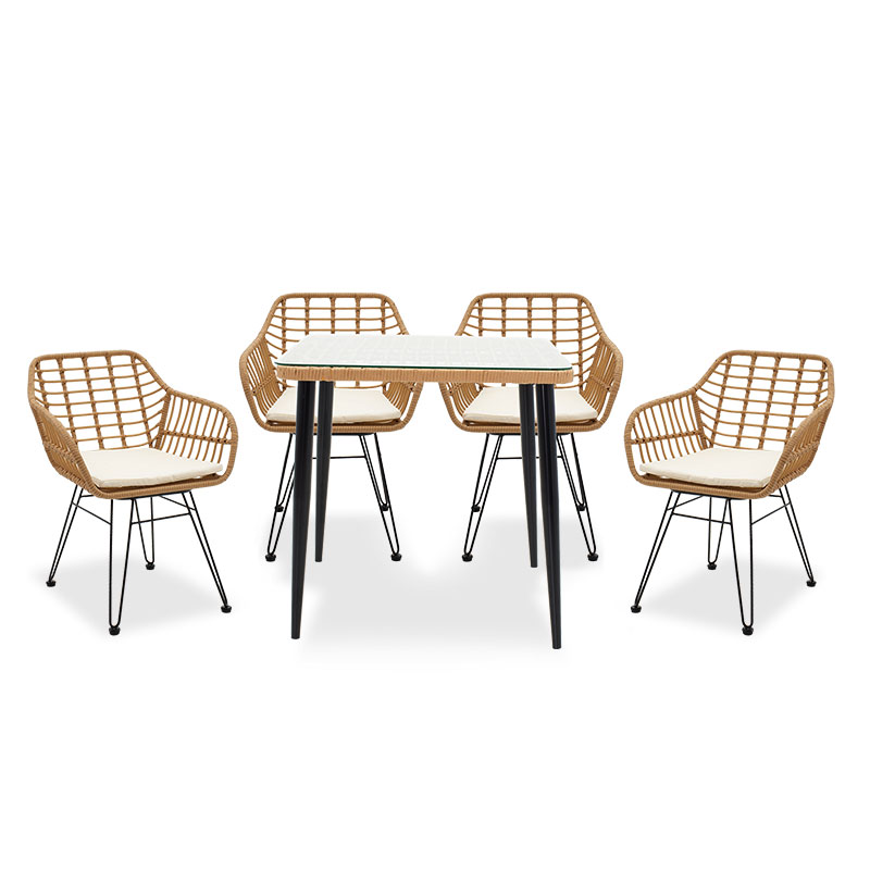 Τραπεζαρία κήπου Naoki σετ 5τεμ pakoworld μέταλλο-μαύρο-pe φυσικόΘέλετε ένα ανθεκτικό σετ τραπεζαρίας για το μπαλκόνι ή τον κήπο σας που θα αναβαθμίσει αισθητικά το χώρο σας; Η σειρά Naoki είναι ιδανική για εσάς καθώς συνδυάζει την αισθητική με την ποιότητα κατασκευής.Το σετ περιλαμβάνει τέσσερις πολυθρόνες και ένα τραπέζι.Τεχνικά χαρακτηριστικά: Σταθερός σκελετός από εξαιρετικής ποιότητας μέταλλο (πόδια D50mm) με αντοχή στην καταπόνηση και στη φθορά. Κυρίως επιφάνεια τραπεζιού από PE rattan. Το PE rattan είναι ένα είδος οικολογικού συνθετικού rattan, ανακυκλώσιμο και με μεγαλύτερη ανθεκτικότητα σε σχέση με τα άλλα είδη. Φέρει υφασμάτινο μαξιλαράκι για την έδρα του καθίσματος 2εκ σε λευκό ivory χρώμα. Το τραπέζι φέρει tempered γυαλί 6χιλ – διάφανο. Μεγάλη ανθεκτικότητα: κατάλληλο για χρήση σε εξωτερικό χώρο εκτεθειμένο στις καιρικές συνθήκες και την υγρασία. Προσφέρεται σε χρώμα: Φυσικό – Μαύρο.Διαστάσεις προϊόντος:Διαστάσεις τραπεζιού: Μήκος: 80 εκ. Πλάτος: 80 εκ. Ύψος: 78 εκ .Διαστάσεις πολυθρόνας: Μήκος: 59 εκ. Πλάτος: 57 εκ. Ύψος: 81 εκ . Ύψος έδρας: 43 εκ.Πληροφορίες υλικών: PE Rattan: Είναι ένα δημοφιλές υλικό, απομίμηση φυσικού rattan, που χρησιμοποιείται στην κατασκευή επίπλων και αξεσουάρ. Κατασκευάζεται από πολυαιθυλένιο (polyethylene), το οποίο είναι μια ανθεκτική συνθετική πολυμερής ρητίνη. Είναι ανθεκτικό στις καιρικές συνθήκες, δεν φθείρεται από τον ήλιο ή τη βροχή και δεν ξεθωριάζει, ενώ παράλληλα είναι φιλικό προς το περιβάλλον. Tempered glass- Γυαλί ασφαλείας: Το tempered glass, γνωστό και ως σκληρυμένο ή θερμικά επεξεργασμένο γυαλί, είναι ένα είδος γυαλιού ασφαλείας που έχει υποστεί ειδική επεξεργασία για να αυξήσει την αντοχή του σε σύγκριση με το απλό γυαλί. Η διαδικασία θερμικής επεξεργασίας περιλαμβάνει τη θέρμανση του γυαλιού σε υψηλή θερμοκρασία και την απότομη ψύξη του. Αυτό δημιουργεί μια τάση συμπίεσης στην επιφάνεια του γυαλιού και μια τάση εφελκυσμού στο εσωτερικό, καθιστώντας το πιο ανθεκτικό σε κρούσεις, θερμικά σοκ και γρατζουνιές. Eίναι περίπου 5 φορές πιο ανθεκτικό από το απλό γυαλί σε κρούσεις. Ένα σημαντικό πλεονέκτημα είναι πως σε περίπτωση θραύσης, το tempered glass θρυμματίζεται σε μικρά, αμβλεία θραύσματα, μειώνοντας τον κίνδυνο σοβαρού τραυματισμού. Χρησιμοποιείται σε τραπέζια, γραφεία, έπιπλα τηλεόρασης κ.ά. Μέταλλο: Το μέταλλο χρησιμοποιείται ευρέως στην κατασκευή επίπλων, προσφέροντας μια σειρά από πλεονεκτήματα σε σχέση με άλλα υλικά. Είναι εξαιρετικά ανθεκτικό σε φθορές, ιδανικό για έπιπλα που προορίζονται για καθημερινή χρήση σε ένα απαιτητικό περιβάλλον. Διατηρεί το σχήμα και τη δομή του άψογα, εξασφαλίζοντας σταθερότητα και μακροζωία στα έπιπλα. Εκτός από τις ιδιότητες που αναφέρθηκαν παραπάνω, το μέταλλο μπορεί να έχει και άλλα χαρακτηριστικά, όπως η αντιμικροβιακή δράση (χαλκός) ή υπεραγωγιμότητα (μολυβδένιο). Ύφασμα μαξιλαριού: Το ύφασμα είναι ένα ευέλικτο υλικό που κατασκευάζεται από την ύφανση, πλέξιμο, βελονιά ή συγκόλληση ινών. Αυτές οι ίνες μπορεί να είναι φυσικές, όπως βαμβάκι, μαλλί ή μετάξι, ή συνθετικές, όπως πολυεστέρας ή νάιλον. Η ύφανση των ινών δημιουργεί ένα δίκτυο που δίνει στο ύφασμα τις ιδιότητές του, όπως η αντοχή, η απαλότητα, η διαπνοή και η ελαστικότητα. Υπάρχουν άπειρες ποικιλίες υφασμάτων, καθεμιά με τα δικά της μοναδικά χαρακτηριστικά και χρήσεις.Οδηγίες συντήρησης: PE Rattan: Είναι εύκολο στη συντήρηση και τον καθαρισμό, απαιτεί α