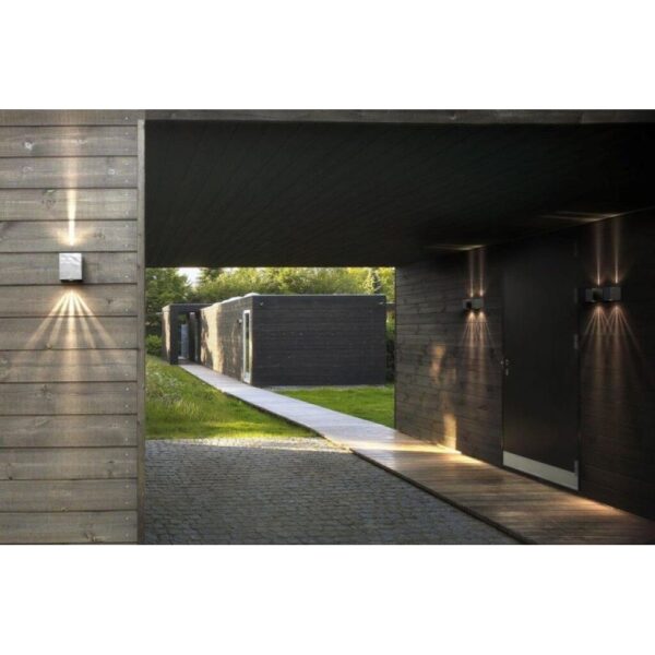 Επίτοιχο φωτιστικό απλίκα δίφωτο εξωτερικού χώρου σε τετράγωνο σχήμα μεταλλικό σε χρώμα νίκελ ματ με διπλή κατεύθυνση φωτισμού πάνω-κάτω και τρείς θέσεις φωτισμού για να διαμορφώσετε το προσωπικό σας στυλ. Διαθέτει ενσωματωμένο LED με ισχύ 5W και απόδοση 500 Lumen σε θερμό λευκό χρώμα 2700Κ.