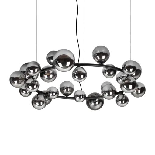 Οι φιμέ γυάλινες σφαίρες διαχέουν το φως με ζεστό και ατμοσφαιρικό τρόπο, δημιουργώντας ένα ιδιαίτερο παιχνίδι φωτός και σκιών. Ο συνδυασμός γυαλιού και μεταλλικών στοιχείων προσδίδει πολυτελή και σύγχρονη αισθητική, καθιστώντας το φωτιστικό ιδανικό για μοντέρνα interiors αλλά και χώρους υψηλής αισθητικής όπως ξενοδοχεία ή εστιατόρια.