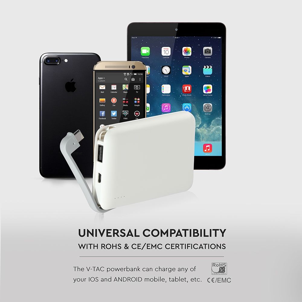 Power Bank 5000mAh Λευκό V-TAC με ενσωματωμένο καλώδιο - 8864