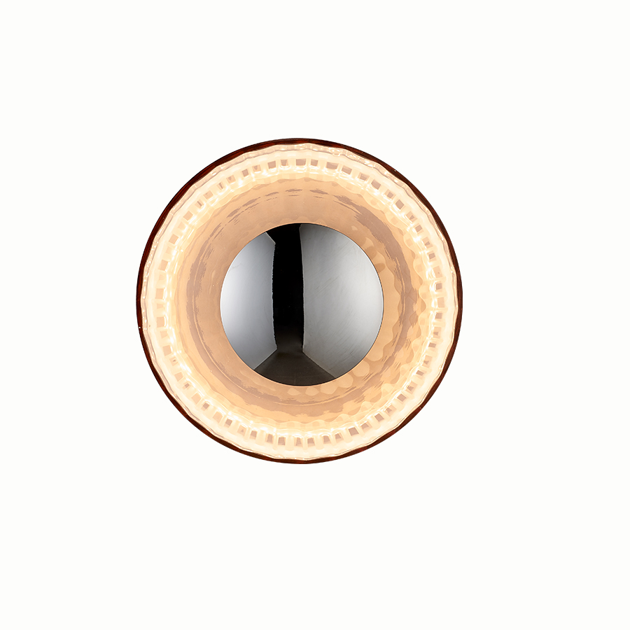 Φωτιστικό τοίχου κατασκευασμένο από χειροποίητο γυαλί χρώματος μελί με μεταλλικά στοιχεία στο χρώμα του χρωμίου. Διαθέτει ενσωματωμένο LED με θερμό χρώμα (3000Κ).