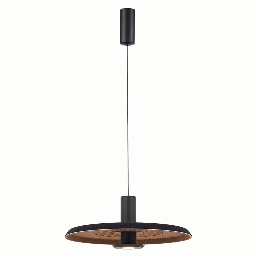 Κρεμαστό 1φωτο φωτιστικό με ηχοαπορροφητικό υλικό (PET Felt) που μειώνει τον θόρυβο στο χώρο σε διχρωμία καφέ και μαύρου χρώματος. Ύψος: 195 εκ.Διάμετρος: 35 εκ.Τύπος Λαμπτήρα: LedWatt: 5WLumen: 630 lmΘερμοκρασία Χρώματος: 3000K, CRI>90Dimmable: Όχι