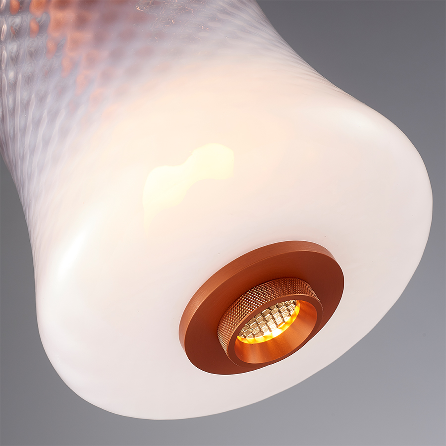 Τρίφωτο κρεμαστό φωτιστικό σε ράγα κατασκευασμένο από χειροποίητα γυαλιά σε μπλε, μελί και απαλό ροζ χρώμα και μεταλλική βάση σε μαύρο χρώμα.