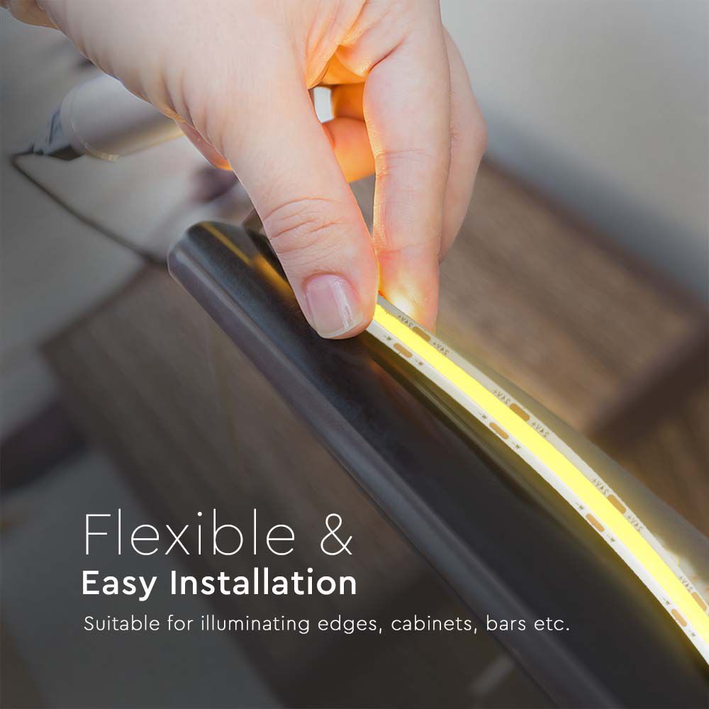Υψηλής απόδοσης LED COB ταινία 18 W/m με 560 LED/m και δυνατότητα επιλογής θερμοκρασίας φωτισμού (CCT 3‑in‑1 2700‑6500 K), λειτουργία σε DC 24 V και CRI >90 — ιδανική για εσωτερικό φωτισμό περιγραμμάτων, ντουλαπιών, ραφιών και design εφαρμογών με ομοιόμορφο, χωρίς ορατά σημεία LED, φωτισμό.